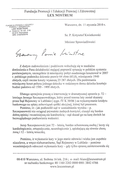 Kopia listu Fundacji Lex Nostrum do Ministerstwa Sprawiedliwości: