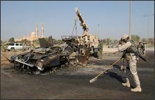 Na zdjęciu amerykański żołnierz czyszczący miejsce ataku.