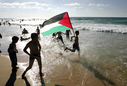 Na zdjęciu Mohamed (13 lat) wbiegający z palestyńską flagą do morza niedaleko miejsca izraelskich osadników w Neve Dekalim. Prawdziwe morze dla chłopca jak i innych przybyłych na plażę Palestyńczyków jest olbrzymim wrażeniem - widzą je pierwszy raz w życiu. 12 września na tej plaży znalazło się tysiące mieszkańców południowej Strefy Gazy. Plaża liczy sobie 3 km długości.